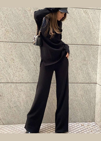 Трикотажный костюм плотной вязки. Удлиненная кофта с разрезами по бокам. Мягкая резинка на штанишках. Доступен в 2-х цветах: черный и оливка.