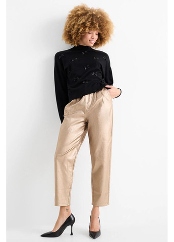Тканые брюки из эластичной ткани с покрытием. Складки на талии, два боковых кармана и два накладных кармана сзади.