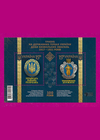 2018 блок Трезубец на государственных гербах Украины эпохи освободительной борьбы 1917-1921 годов. Каталожный номер: 1671-1672 (b163). Дата выпуска: 10.10.2018 Выставленные на продажу марки Украины чистые, в отличном состоянии, без каких-либо дефектов. Перед отправкой мы надежно упаковываем марки в плотный картон, чтобы предотвратить повреждение при пересылке.