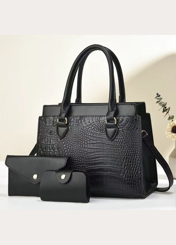 Сумка женская классическая в наборе картхолдер и кошелек. Черная Красивая женская сумочка. В комплекте с сумкой идет небольшой кошелек или косметичка и картхолдер. Три отделения. Главное - на молнии, после молнии есть одно большое отделение. Внутри карманы на молнии и карман для телефона. Материал: PU Кожа . · Длинный ремень 140 см на плечо Внешние размеры сумочки: · Длина 28 см · Высота 22 см · Ширина 13 см Материал: экокожа с тиснением рептилия.