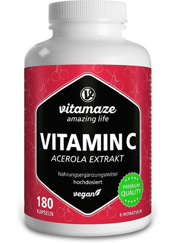 Высокая доза: 180 веганских капсул каждая из 660 мг экстракта ацеролы, из которых 160 мг натурального витамина С в течение 6 месяцев непрерывной доставки. Чистый натуральный экстракт вишни ацеролы в веганской капсуле без других ингредиентов. Витамин С является центральным витамином для иммунной системы. Для веганов: капсулы витамина C Acerola производятся исключительно из ингредиентов не животного происхождения, поэтому идеально подходят для веганов и вегетарианцев. Наш продукт содержит генетически модифицированных ингредиентов и ненужных добавок. Лучшая биодоступность: без спорной добавки магния стеарат (магниевые соли жирных кислот) для оптимального усвоения активных ингредиентов. Многие другие производители используют стеарат магния как раздельный агент в производстве. Немецкий качественный продукт: мы производим только в Германии. Наше производство отвечает стандартам НАССР. Мы тесно сотрудничаем с экспертами по разработке и производству нашей продукции. Информация о безопасности: Не превышайте рекомендуемую дозу. Диетические добавки не являются заменой сбалансированного и разнообразного питания и здорового образа жизни. Не подходит для детей и подростков. Храните продукт закрытым, в прохладном, сухом и недоступном для детей месте. Минимальный срок годности до конца/номер партии: смотрите дно банки. Ингредиенты: Экстракт ацеролы (витамин С), оболочка капсулы (гидроксипропилметилцеллюлоза). Направления: Принимать по 1 капсуле ежедневно, запивая достаточным количеством воды.