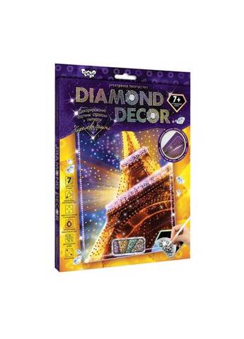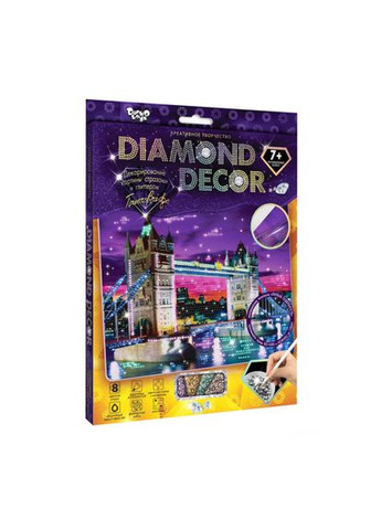 Набор творчества Diamond Decor от производителя Danko Toys "Diamond Decor" – серия наборов креативного творчества, выполненная в технике декорирования стразами, предназначена не только для взрослых, но и для детей! Простая в исполнении и очень красивая картина, будет сиять «Бриллиантовым Блеском», пленив и покоряя взгляды опытных зрителей! Каждый установленный камень, передающий и излучающий неповторимый и только заметный глазу, волшебный блеск, а сияющий глиттер, придает картине дополнительное сияние! Сделать такой шедевр очень просто и по силам даже ребенку! На картину нанесен липкий слой, который позволит без клея закрепить стразы, а указанные номера делают работу очень простой и интуитивно понятной! Специальный карандаш-аппликатор для захвата и расстановки страз поможет легко расставить «алмазы» по своим местам. Итак, берем картину, стразы и глиттер, и приступаем к созданию сияющего шедевра, который станет не только красивым украшением Вашего дома, но и бесценным подарком близкого человека! Размер упаковки: 27,5х22х1,5 см. Возраст: 7+ - картина-схема с номерами; - стразы; - глиттерные блестки; - карандаш-аппликатор; - акриловый лак. Липкая поверхность картины позволяет ребенку не использовать клей и ножницы. Отправим по всей Украине оптом и в розницу