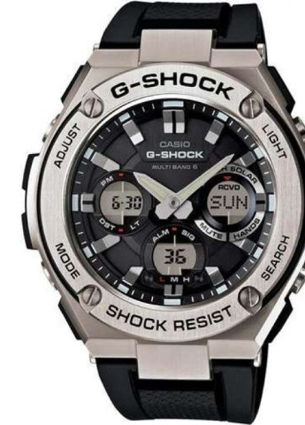 Тип ремешка: Каучуковый; Производитель: Casio G-Shock; Пол: Мужские; Подсветка: Светонакопители на стрелках и цифрах/метках; Светодиодная подсветка; Тип индикации: Аналоговые+цифровые; Стиль: Спортивные; Стекло: Минеральное; Цвет: Черный; Размер, мм: 59.1 x 52.4 x 16.1 мм.; Форма корпуса: Круглые; Страна производитель: Япония; Гарантия: 24 месяцев; Механизм: Кварцевые + Механизм – Солнечная батарея; Материал корпуса: Нержавеющая сталь; Водонепроницаемость: 20 ATM; Цвет корпуса: Серебристый; Цвет ремня: Черный; Доп. фунц.: Прием радиосигнала; Мировое время; Таймер обратного отсчета; Уровень заряда аккумулятора; 12/24ч. формат времени; Питание от солнечной батареи; EOL - индикации окончания заряда батарейки;