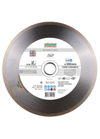Круг алмазный Distar Hard Ceramics предназначен для высококачественной резки керамической плитки с наличием декоративного покрытия и без него, а также керамогранитов. Скорость реза в минуту составляет 1.1 метров погонных, при ресурсе в 1000 пог. м, благодаря своему ресурсу на обработку материала, достигается выгодная эксплуатация инструмента посредством меньших затрат. В большинстве своем применяется для работы с рельефной глазурью, настенной и напольной керамикой, керамогранитом, а также всеми видами гранита и мрамора в редких случаях.