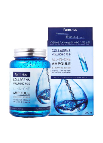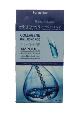 Многофункциональная ампульная сыворотка FarmStay Collagen & Hyaluronic Acid All-In One Ampoule - оказывает осветляющий и антивозрастной эффект. Морской коллаген и гиалуроновая кислота поддерживают здоровое сияние и гладкость кожи. Понижение выработки коллагена в коже плохо отражается на ее состоянии. Кожа пересыхает, покрывается морщинками, становится слабее и тоньше. Наша ампула с коллагеном предназначена специально для поддержания свежести и молодости кожи, а также насыщения ее витаминами и минералами. Морской коллаген и гиалуроновая кислота играют важную роль в увлажнении и укреплении кожного покрова. А витаминные микрогранулы в сыворотке сделают вашу кожу сияющей и ровной. Аденозин делает средство более эффективным против морщин, а ниацинамид помогает осветлить пигментацию. Способ применения: После нанесения тонера или эмульсии возьмите немного средства, массирующими движениями нанесите на всю поверхность лица. Меры предосторожности: Избегать попадания в глаза, в случае несовместимости с кожей прекратите использование.