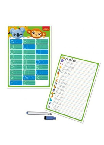 Развивающая доска-тренажер для самых маленьких. На одной стороне доски изображены буквы английского алфавита, которые ребенок сможет обводить и писать самостоятельно стирающимся маркером. На обратной стороне изображены разные животные и предметы с их названиями на английском языке — ребенок сможет обводить слова и научится писать их самостоятельно.
