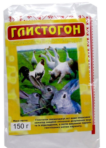 В состав антигельминтного препарата глистогон (альбендазол) входит: альбендазол – 1,5 г; наполнитель – до 150 г. Фармакологические свойства Альбендазол, активное вещество препарата, уничтожает все разновидности кишечных нематод благодаря изменениям созревания яиц и их отложению, а затем вызывает паралич глянцевых клеток паразита. Дозировка Свиньи (аскаридоз) - 3 г на 1 кг. живой массы (но не более 150 г на 1 животное). Кроллы (посалуроз) – 10 г на 1 кг. живой массы. Куры (аскаридоз) – 2 г на 1 кг. живой массы. Гуси (амидостоматоз) – 5 г на 1 кг. живой массы 2 суток подряд. ПРЕДУПРЕЖДЕНИЕ После применения препарата ГЛИСТОГОН (альбендазол) мясо животных и яйца запрещено использовать для пищевых целей в течение 4 дней, а молоко - в течение 24 часов.