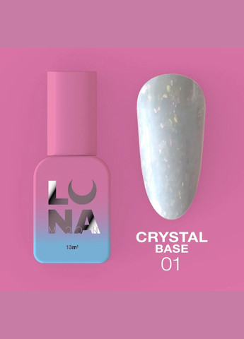 Crystal Base 01 – это база с блестками для покрытия и выравнивания ногтей. Особенности: Слабокислотная 5-6 pH. Эластичная и гибкая. Высокий уровень перекрытия натурального ногтя из-за высокой пигментации. Может давать минимальную усадку в процессе ношения из-за того, что она упругая. Консистенция средняя, самовыравнивающаяся. Обеспечивает носибельность без отслойки 3-4 недели. Обладает нейтральным запахом. Исключает сильный нагрев ногтевой пластины в процессе полимеризации, поэтому не вызывает жжения в лампе. Гипоаллергенная. Хорошо снимается как спиливанием, так и жидкостью. Не течет и быстро самовыравниваются. Нуждается в подкладках с Rubber base. Не подходит для выравнивания длинных ногтей без предварительного укрепления. Время сушки в лампе 120 секунд. Можно дополнительно разогревать, чтобы сделать консистенцию еще реже. Мощность лампы для просушки – 48 W (это должна быть только оригинальная лампа). Основное правило при выравнивании – толщина должна быть 1-1,5 мм на торце. Тиксотропная – становится редкой в работе при движениях кисточки. Способ нанесения: 1. Снятие. 2. Форму ногтя не опыляем. Или оставляем запасных 2 мм длины, которые опыляем и уберем после выравнивания. 3. Пилой 220 грит опыляем без сильного нажатия ноготь сверху, приподнимая чешуйки ногтевой пластины или же используем баф 100 грит. 4. Маникюр. 5. Если вы работаете ремувером, после их использования нужно помыть руки водой с мылом. 6. Обезжиривание ногтя. Нужно сделать два подхода. Используем 4 салфетки. Одна салфетка на 5 пальцев. Первый подход – протираем поверхность ногтя. Второй подход – берем апельсиновую палочку, одеваем салфетку и протираем все в зоне кутикулы и в пазухах. 7. Дегидратор (не обязательно) 8. Праймер используем по желанию. Но если база для подложки обладает достаточной кислотностью, то праймер не нужен. 9. Подкладка из Rubber base Lunamoon. Лучше всего наносить плоской кистью для геля. Движения должны быть втираются. Важно прорисовать все пазухи ногтя. Сушить 30 секунд. 10. Стереть липкость. 11. Выравнивание. Высушить в лампе 120 секунд. 12. Опыль формы после выравнивания. Это нужно для того, чтобы на торце образовалась толщина, которая будет держать свободный край. 13. После опилия стираем липкость. 14. Нанести топ и высушить 120 секунд. После просушки ничем не протирать, ведь может потеряться блеск.