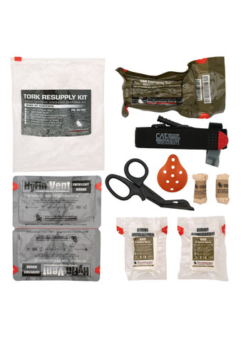 вес - 500 г размеры - 18 см Д х 18 см Ш х 7,6 см Г набор для удобной пополнения Tactical Operator's Response Kit (TORK®) аптечка упакована в пластиковый зип-пакет для легкого доступа к содержимому специальные красные флажки для легкой идентификации использованных товаров аптечка содержит все необходимое для предотвращения наиболее типичных сценариев смерти в тактической среде Tactical Operator Response Kit® (TORK®) разработан как компактная индивидуальная аптечка для оказания первой помощи. В ней содержится все необходимое для предотвращения наиболее распространенных причин смерти на поле боя. TORK® Supply Kit это та же аптечка, что и классический TORK®, только без сумки. Ее можно использовать для пополнения уже использованных аптечек. Данный набор упакован в специальный зип-пакет со списком содержимого на внешней стороне. Таким образом можно отмечать какие элементы аптечки были изъяты. В комплекте: 1 x S-Rolled Gauze (4,5 дюйма x 4,1 ярда) 2 x пары Bear Claw™ Nitrile Glove, Lg. 1 x HyFin® Vent Chest Seal Twin Pack 1 x Combat Gauze® Hemostatic Dressing 1 x ETD 6 дюймов Emergency Trauma Dressing 1 x пара Responder Trauma Shears (7,25 дюйма) 1 x Зип-пакет, в котором размещена аптечка 1 x Накладка на глаза NAR "Polycarbonate Eye Shield (PES)" 1 х Турникет NAR "Combat Application Tourniquet (C-A-T)" (цвет Черный)