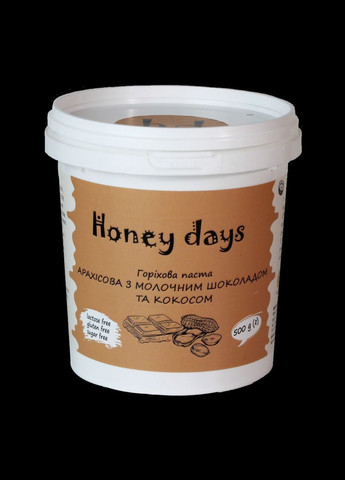 Арахисовая паста Honey Days с молочным шоколадом и кокосом – 500 г Состав: жареные ядра арахиса 70%, кокосовая стружка, мед разнотравья, какао тертое, какао масло, сухое кокосовое молоко. Почему наш продукт? Паста очень нежная! (Потому что готовится из бланшированного арахиса (без кожуры)). Паста имеет кремовую структуру! (Современное оборудование позволяет измельчить арахис во фракцию менее 50 микрон). Паста качественная! (все ингредиенты проходят контроль качества перед приготовлением). Паста полезна! (Содержит ненасыщенные жирные кислоты Омега-6, богата микроэлементами и витаминами, которые необходимы для нормального функционирования организма). Употребление пасты способствует развитию мозговой активности и улучшает память! Обладает незабываемым и неповторимым вкусом! В пасте отсутствуют: сахар, растительное масло, лактоза, глютен, консерванты, трансжиры и эмульгаторы! Питательная ценность на 100 г продукта: Энергетическая ценность – 2376 кДж / 568 ккал Белки – 18,9 г (g) Жиры – 46,8 г (g) Углеводы – 27,4 г (g) Условия хранения: при температуре от 0 С до +25 С и относительной влажности воздуха не более 75%. Продукция не должна подвергаться воздействию прямых солнечных лучей.