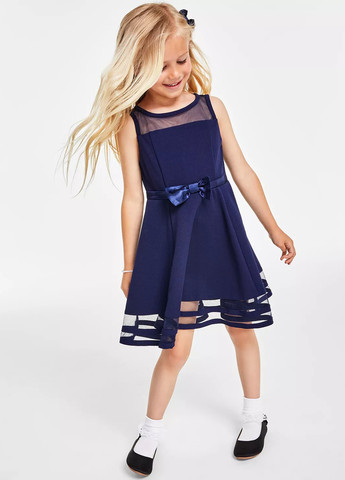 Нарядное платье для девочек Calvin Klein. Стильное платье для особых случев и для повседневной носки. Детское платье без рукавов. Круглый вырез. Украшен  атласным поясом с бантом. Верх и низ декорирован сетчатыми вставками. Сзади застежка на молнию и пуговицу. Отличное качество.