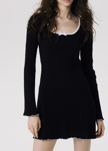 Короткое платье из хлопкового трикотажа в рубчик с приталенным лифом и слегка расклешенной юбкой. Квадратный вырез с узкой окантовкой и небольшим декоративным атласным бантиком спереди. Длинные рукава-труба и оверлок на манжетах и подоле. Обрезка, бантик и края оверлока выполнены в контрастных цветах.