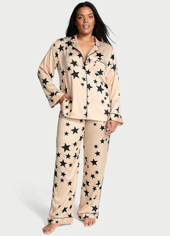 Женская сатиновая пижама Victoria’s Secret. Нежная, мягкая как шелк, роскошная атласная пижама от Victoria´s Secret. Комплект состоит из рубашки на пуговицах и штанов на эластичном поясе с завязками. Легкая, приятная к телу ткань. Пижамная рубашка с длинным рукавом и нагрудным карманом с вышитым логотипом, декоративной окантовкой, отложным воротником и разрезами по бокам. Штаны имеют два кармана в швах. Принт - контрастные звезды разной величины. Машинная стирка.