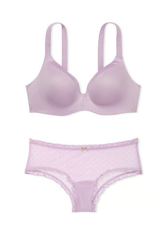 Женский комплект белья Victoria´s Secret Infinity Flex. Шикарный комплект, в который входит гладкий бюст и кружевные трусики чики. Лиф благодаря своему минималистичном дизайну выглядит стильно и современно, и подходит для любых моделей одежды. Очень удобный, без косточек, ультрамягкий и комфортный бюстик на каждый день. Регулируемые бретели, сзади отстегиваются при необходимости. Этот бюстгальтер создан, чтобы со временем адаптироваться к вашему телу. Чем больше вы его носите, тем лучше он подходит. Если поначалу ремешок кажется вам тесным, мы рекомендуем застегнуть его на самый свободный крючок. Адаптивная технология чашек подстраивается под вашу постоянно меняющуюся форму и естественные колебания размера для максимально комфортной поддержки. Мягкая ткань с 4-сторонним растяжением и беспроводная конструкция. Разглаживающий ремешок и бесшовный атласный Infinity Edge сливаются с вашей кожей, практически исчезая под одеждой. Сексуальные кружевные трусики чики. Нежные кружево из сеточки в мелкий горошек с золотистым бантиком. Очень приятный к телу материал. Хлопковая ластовица. Отличное качество.