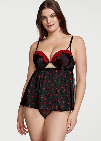 Легкий и воздушный комплект от Victoria´s Secret. Комплект состоит из нежного пеньюара и трусиков стрингов. Бюст Push-Up на косточках, украшен кружевом. Сзади сеточка. Застежка сзади на крючки. Регулируемые бретели, украшены бантиками. Пеньюар из невесомой атласной ткани спереди и сетчатой ткани сзади. Эластичный пояс. Сетчатые трусики-стринги с регулируемыми эластичными бретелями по бокам для удобной и комфортной посадки. Принт комплекта - вишенки. Отличное качество.
