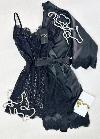 Изысканный домашний комплект пеньюар и халатом из шелка/атласа с французском кружевом. Неподражаемый и безупречный крой комплекта из халатика и пеньюара из шелка, позволяет идеально подчеркнет фигуру абсолютно не сковывая движение,а французское кружево придаст вашему образу нежность и романтичность.Удобный комплект станет вашим постоянным спутником не только дома ,но и на любом курорте мира. Комплект выполнен из приятного к телу материала шелк/атлас. Модель украшена нежным французским кружевом.