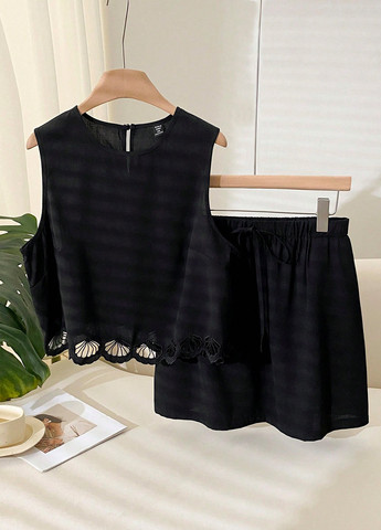 Костюм из 2 предметов предлагает удобный и стильный вариант для повседневной носки. Майка имеет круглый вырез и декоративную вышивку. Юбка выполнена в минималистском стиле с ажурной деталью. Подходит для повседневного использования и отпуска. Изделие имеет стандартный крой. Ткань не тянется. Детали включают пуговицы и застежку-узел.