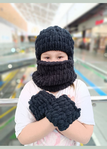 Теплая вязаная детская шапка-балаклава. Митенки в подарок. Цвет - черный, ручная работа, материал - пряжа Puffy Alizee. Размер один универсальный. (митенки в подарок) (60/770/1060 - черный)