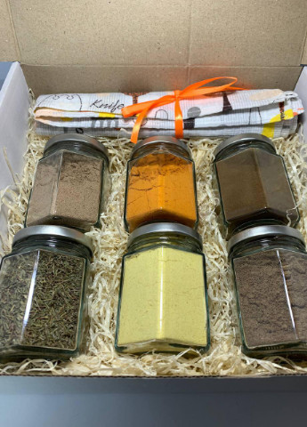 Приправы расфасованы в стеклянные банки объемом 200 мл. Набор упакован в большую картонную коробку с наполнителем древесная стружка. Дополнительно коробка обматывается подарочной лентой или бечевкой с поздравительной биркой на ваш выбор. В состав набора входят: - барбарис синий сушеный 45 грамм. - кумин (зира) 75 грамм. - куркума молотая 80 грамм. - чеснок сушеный гранулы 115 грамм. - морковь сушеная 90 грамм. - орегано 45 грамм. - кухонное полотенце* Специи в набор фасуются в день заказа, так что свежесть и качество гарантированы. Фото не из интернета, реальный товар в наличии. Огромный ассортимент специй, один из самых больших в Украине - более 140 видов специй и приправ в одном месте. Также в наличии аксессуары - мельницы, емкости для хранения. Создаем подарочные наборы. Переходите по ссылке на название магазина и смотрите все товары. Фасовку можем сделать любую - от 50 грамм. Отправляем в день заказа. В каждой посылке вас ждет сюрприз от "Перчика". *внешний вид этого аксессуара может отличаться от представленного на фото.