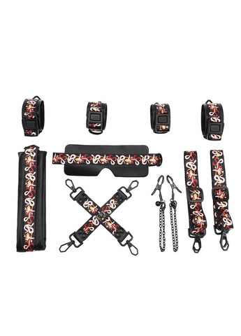 Пришло время раскрыть свою дикую сторону! Предлагаем купить БДСМ-набор Liebe Seele Leopard Print 13pcs set, в который входит все, что нужно для захватывающих БДСМ-сессий и воплощения ваших эротических фантазий. Леопардовый принт добавляет страсти и выглядит просто восхитительно! В набор входит 13 аксессуаров: наручники, поножи, ошейник с поводком, крестовина для фиксации рук и ног, кляп, веревка для бондажа, флоггер, паддл, маска на глаза, анальная пробка, игривые пэстис с кисточками, низкотемпературная свеча и зажимы для сосков. Комбинируйте аксессуары или используйте по отдельности. Аксессуары изготовлены из качественной экокожи и дополнены бархатной подкладкой. Сделайте свои игры с подчинением и наказанием по-настоящему роскошными и страстными с этими невероятными леопардовыми аксессуарами! Большой БДСМ-набор Liebe Seele Leopard Print 13pcs set содержит все необходимое и для возбуждающих ласк, и для строгих наказаний, и для создания привлекательного образа. Леопардовый принт отлично сочетается с черным металлом. В набор входит: Наручники с соединительной цепочкой. Цепочка съемная, крепится на карабин, так что вы можете использовать наручники и с цепочкой, и без нее. Свободно регулируются по размеру с помощью липучек. Бархатная подкладка обеспечивает комфорт даже при долгих сессиях. Длина манжеты: 24,5 см, ширина 6 см, длина цепочки 16 см. Поножи для фиксации ног, также со свободной регулировкой по объему с помощью липучки. Оснащены съемной цепочкой на карабинах. Внутри — бархатная подкладка, что помогает избежать натираний и раздражения. Длина манжеты: 29,5 см, ширина 6 см, соединительная цепочка 18 см. Ошейник с поводком. Широкий, фантастически красивый ошейник оснащен кольцом для крепления поводка, наручников или других фиксирующих средств. Мягкая бархатная подкладка не будет натирать нежную кожу на шее. Просто регулируется по объему с помощью липучки. Поводок-цепочка крепится на карабине, ручка-петля с леопардовым принтом делает игру приятной и комфортной. Длина ошейника: 44 см, ширина 4,2 см. Длина цепочки 73 см. Крестовина с большими карабинами открывает широкие возможности для реализации самых возбуждающих сценариев! Соедините с ее помощью руки и ноги так, как вам хочется, и наслаждайтесь неподвижностью партнера или партнерши! Размеры крестовины: 15×15 см. Кляп-шарик на широком креплении со свободной регулировкой по объему с помощью липучки. Отлично садится на голове и удобно размещается во рту благодаря гибкому креплению шарика. Длина ремня: 52 см, ширина 4 см. Диаметр шарика: 3,3 см. Веревка для бондажа длиной 5 м позволяет поэкспериментировать с обвязками шибари либо связать партнера так, как вам захочется. Флоггер с оплетенной рукояткой и множеством мягких хвостов — идеальный девайс для игры, ведь он дает возможность и нежно гладить, и слегка пошлепывать, и сильно ударять. Петля на ручке обеспечивает уверенный хват и сильный удар. Общая длина флоггера: 50 см, длина ручки 15,6 см. Паддл для чувствительного воздействия. Он достаточно плотный и поможет наказать партнера так, как он того заслуживает! На ручке есть мягкая петля для вашего удобства. Длина паддла: 23 см, ширина 5,5 см. Маска на глаза — роскошное дополнение! Маска на широкой резинке плотно прилегает к лицу, закрывает обзор и дает возможность сосредоточиться на тактильных ощущениях. И к тому же она фантас