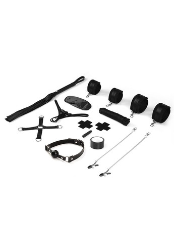 Максимально полный набор для удовольствия и наказания! Предлагаем купить БДСМ-набор Liebe Seele Bound You 12pcs set, состоящий из 12 замечательных аксессуаров, от трусиков до флогера. Безопасный для использования даже новичками, из крепких материалов, он мгновенно погрузит вас в волнительный мир приключений БДСМ! В наборе есть: наручники, поножи, крестовина, кляп, маска на глаза, зажимы для сосков, веревка и скотч для бондажа, флогер, шикарные трусики-стринги, наклейки на соски и мощная виброшар на батарейках (батарейка в комплекте не идет). Все детали заключены в атласный мешочек для хранения. Раскройте всю свою чувственность и пристрастие с этим набором! Хотите попробовать что-нибудь новенькое или ищете большой набор для реализации своих фантазий? В любом случае, этот набор вам подойдет! Все детали сделаны из качественных материалов, выполнены в классическом черном цвете и дополнены привлекательной металлической фурнитурой. Наручники и поножи – из неопрена, что обеспечивает им невероятную износостойкость. Кроме того, неопрен хорошо выдерживает перепады температур, не пропускает влагу и устойчив к механическому воздействию – то, что нужно для воплощения БДСМ-фантазий! В БДСМ-наборе Liebe Seele Bound You 12pcs set вы найдете: Наручники со свободной регулировкой, на липучках. Широкие и мягкие они надежно зафиксируют руки в выбранной позиции. Оснащены карабинами для соединения друг с другом, с ногами, ошейником, поводком и тем, чем вам вздумается. Длина: 25 см, ширина 5,5см. Поножи на липучках, легко регулируются по обхвату лодыжки. Мягкий и толстый неопрен позволяет достаточно сильно затягивать ноги на ногах. На каждом — карабин для соединения друг с другом, с цепочкой, с наручниками и т.д. Длина: 30 см, ширина 5,5см. Крестовина на металлическом кольце. Изготовлена из очень крепкого, но мягкого текстиля, части крестовины свободно перемещаются по кольцу для разнообразного крепления. Четыре кольца для крепления рук и ног. Размеры: 26,5×26,5 см. Кляп на ремешке из экокожи. Прекрасно садится на голове благодаря регулировке с помощью пряжки и гибкого крепления шарика. Сам шарик невелик, так что подойдет даже для новичков. Общая длина: 58 см, объем головы 40-52 см. Диаметр шарика 3,3 см. Маска на глаза. Маска мягкая из шелковистого материала имеет двойную резинку для вашего удобства. Не пропускает свет и обеспечивает полное отключение зрения, чтобы сосредоточиться на тактильных ощущениях! Размеры маски: 18,5×8,5 см. Зажимы на двух цепочках с карабинами для сосков. Их можно соединять между собой или крепить к наручникам или другим аксессуарам. Сила сжатия регулируется с помощью винтов. Силиконовые накладки позволяют избежать повреждений нежной кожи сосков. Длина одной цепочки с зажимом: 41,5 см. Веревка для связывания – тонкая и крепкая, длиной 10 метров, она очень хорошо подойдет для шибари и любых ваших фантазий со связыванием. Скотч для бондажа черного цвета поможет воплотить все ваши мечты в реальность и надежно зафиксирует партнера или партнершу. Длина: 15м, ширина 1,7см. Флогер из экокожи, с оплетенной рукояткой и петлей для надежного захвата, уверенного покушения и мощного удара. Флогер – идеальный девайс для начинающих, ведь им можно и гладить, и шлепать и наказывать. Общая длина: 54 см, диаметр ручки 2,1 см. Трусики-стринги: маленькое кружево спереди и игривый сзади бантик. Очень с