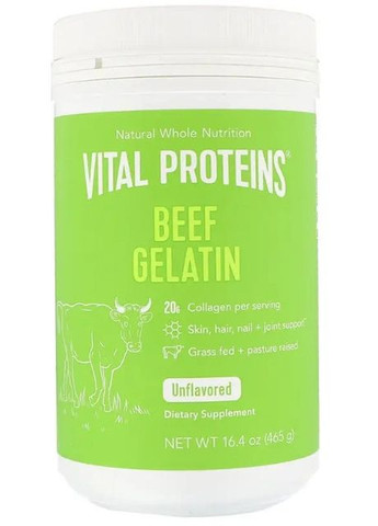 Желатин яловичий (Beef Gelatin) - это универсальный ингредиент, который лучше всего использовать в горячих жидкостях и рецептах. Комплекс натуральных питательных веществ для кожи, волос, ногтей и суставов. Кошерный продукт. Производитель: Vital Proteins, США Форма выпуска: порошок 465 г/907 г Возраст: 18+ Состав: Компонент Состав 1 порции (2 мерные ложки или 20 г) Калории 70 Белок 17 г Натрий 30 мг Колаген 20 г Другие ингредиенты: Желатин из кожи крупного рогатого скота. Функциональное действие: Эта форма коллагена способствует здоровью костей и суставов, а также питает кишечник. Его можно добавлять в чай и кофе, использовать для загущения супов и тушеного мяса, а также добавлять в десерты и выпечку. Начинайте или заканчивайте свой день с датным желатином. Колаген - это сложный структурный белок, который придает прочность и гибкость всему телу. Около 30% всего белка в организме представлено коллагеном. Колаген – это основной строительный белок хрящевой ткани. Он составляет 50% от всего белка хрящевой ткани и 85-90% коллагена в суставном хряще. С возрастом способность организма вырабатывать коллаген снижается, коллагеновые волокна теряют влагу, текстуру и становятся жесткими. Применение: Смешайте 1-2 ложки из 120 мл холодной жидкости, тщательно перемешайте, дайте постоять 1 минуту, затем добавьте 180 мл горячей жидкости и тщательно перемешайте. Противопоказания: Индивидуальная непереносимость компонентов. Предостережение: При беременности, кормлении грудью, приеме медицинских препаратов или наличии любых заболеваний следует проконсультироваться с врачом перед употреблением пищевых добавок. При возникновении побочных реакций прекратите использование и проконсультируйтесь с врачом. Хранить в недоступном для детей месте. Не использовать, если внешняя защитная мембрана отсутствует или повреждена. *** Производитель оставляет за собой право изменить внешний вид упаковки. Мы стараемся следить за изменениями, но если вы заметили любое несоответствие, пожалуйста, сообщите нам об этом в листьях или комментарии к товару. Альберти! **** БАД не является лекарственным средством!