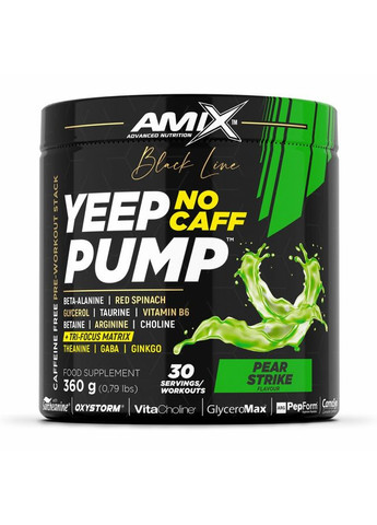 Предтренировочный комплекс без стимуляторов Amix Black Line Yeep Pump No Caff 360 г Pear Strike Предтренировочный комплекс без стимуляторов Amix Black Line Yeep Pump No Caff 360 г Pear Strike Black Line Yeep Pump No Caff от Amix - это мощный предтренировочный комплекс без кофеина, разработанный для увеличения выносливости, пампинга, концентрации и силы. Формула идеально подходит для вечерних тренировок и для тех, кто хочет избежать стимуляторов, но при этом получить максимальный эффект от занятий. Полезные свойства: Мощный пампинг – цитруллин малат и аргинин расширяют сосуды, усиливая приток крови к мышцам. Увеличение выносливости – бета-аланин снижает утомляемость и улучшает производительность. Фокус и концентрация – холин и тирозин поддерживают работу мозга во время тренировки. Без кофеина – подходит для вечерних тренировок и тех, кто чувствителен к стимуляторам. Быстрое усвоение – порошковая форма обеспечивает мгновенное действие. Идеален для бодибилдинга, кроссфита и силовых тренировок. Не вызывает резких скачков энергии и последующего спада. Состав в одной порции 12 г (1,5 мерной ложки): CarnoSyn® Beta-alanine - 3000 mg Arginine Matrix - 3000 mg L-arginine HCl - 1500 mg L-arginine AKG - 1000 mg PepForm® Arginine Peptides - 500 mg Taurine - 1000 mg L-Lysine - 1000 mg Tri-Focus Matrix - 650 mg GABA - Gamma Amino-Butyric Acid- 500 mg Suntheanine® L-theanine- 100 mg Ginkgo Biloba - 50 mg Glycerol powder 65% GlyceroMaxTM - 500 mg VitaCholine® Choline L-bitartrate - 500 mg Oxystorm® red spinach extract (Amaranthus hypochondriacus) - 500 mg Betaine HCl - 500 mg Vitamin B6 - 20 mg Ингредиенты вкус Pear Strike: бета-аланин CarnoSyn®, L-аргинин HCl, L-аргинин AKG, таурин, L-лизин, регуляторы кислотности: лимонная кислота и яблочная кислота; ГАМК - гамма-аминомасляная кислота, бетаин HCl, экстракт красного шпината Oxystorm® (Amaranthus hypochondriacus), холин L-битартрат VitaCholine®, GlyceroMax® (глицерин 65%, антислеживающий агент: диоксид кремния), аргининовые пептиды PepForm® (сывороточные пептиды, L-аргинин), подсластители: сукралоза и ацесульфам-К; антислеживающий агент: диоксид кремния; Гинкго билоба 4:1, L-теанин Suntheanine®, ароматизатор, эмульгатор: соевый лецитин; краситель: медный хлорофиллин; пиридоксин HCl (вит. B6). Рекомендации по применению Принимайте по 12 г (1,5 мерной ложки) за 45 минут до тренировки. Размешайте порцию 12 г в 200 мл воды.