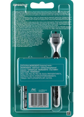 Описание Станок для бритья с 5 сменными кассетами Плавное, эффективное, комфортное и безопасное бритье возможно с помощью Gillette Mach3! Уникальная бритва с тремя лезвиями для безупречного удаления волосков защитит кожу от раздражения и красноты. Она представлена в наборе с 5 сменными кассетами, чтобы сэкономить ваши деньги и дать возможность своевременно менять насадки. В 2018-2019 годах Gillette Mach3 приобрела статус самой популярной мужской бритвы по информации о продажах Nielsen. Особенности бритвы Gillette Mach3: - три лезвия из высококачественной стали, которые обеспечивают до 15 процессов бритья; - гарантирует гладкое бритье без порезов и царапин; - прочные лезвия значительно дольше остаются острыми по сравнению с бритвой Sensor3; шарнирная головка способствует регулировке давления; - удобная сбалансированная рукоятка с резиновыми вставками. Способ применения Применяется для сбривания волосяного покрова на лице. Лицо предварительно необходимо смочить теплой водой, нанести пенку или гель для бритья и после этого использовать бритву. Состав PEG-45M, PEG-180M, PEG-100, PEG-7M, Methyl Di-T-Butyl Hydroxyhydrocinnamate, Silica, Citric Acid, BHT
