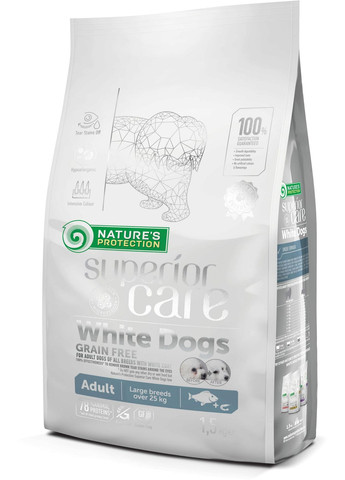 Корм Nature's Protection Superior Care White Dogs Grain Free Junior All Breeds принадлежит к полнорационным кормам супер премиум класса, которые производятся с применением инновационных технологий, максимально позволяющих сохранить полезные свойства продуктов. Корм предназначен для щенков собак всех пород с белой окраской шерсти в возрасте до одного года. У нас вы найдете и другие качественные корма для собак, не зависимо от его окраса. Преимущества: Может помочь снизить риск возникновения бурых пятен от слез под глазами и слюны вокруг бороды и лап. Корм разработан с целью поддержания необходимого прозрачного состава слезной жидкости. Данный корм для щенков сделан из свежего, высококачественного лосося из Норвегии. В его составе много особенно полезных видов аминокислот Омега-3 – идеально сохраняют кожу и шкуру вашего питомца. Подходит для домашних питомцев с чувствительной системой пищеварения, потому что беззерновые корма не раздражают пищеварительный тракт. Состав: лосось 44% (сушеный и измельченный), сушеный картофель, батат, жир птицы, горох, мука из криля (мин. 4 %), жом сахарной свеклы, лососевое масло, семена льна, динамически микронизированный клиноптилолит (1 %), фруктоолигосахариды, экстракт юкки, сушеная календула (источник лютеина). Аналитический состав / 1 кг: сырой белок – 26 %, сырая клетчатка – 3 %, сырой жир – 15 %, сырая зола – 8,5 %, кальций – 1,4 %, фосфор – 1 %, калий – 0,6 %, натрий – 0,4 %, Омега-0,3 жирные кислоты 2,57%. Добавки пищевые / 1 кг: витамин A – 18000 МЕ, витамин D3 –1500 МЕ, витамин E – 530 мг, фолиевая кислота – 1 мг, биотин – 1 мг, моногидрат сульфата железа – 50 мг, безводный йодат кальция – 1,5 мг, пентагидрат сульфат 20 мг, сульфат цинка моногидрат – 115 мг, селенит натрия – 0,1 мг. Технологические добавки: экстракт розмарина, богатые токоферолом экстракты растительных масел. Рекомендуемые нормы кормления: Возраст щенка (мес.) Вес взрослой собаки (кг) 2 4 6 8 10 15 25 35 50 60 Дневная норма (г/день) 3 46 77 104 129 153 199 266 348 4 141 166 219 310 397 520 596 7 52 87 118 147 173 231 337 429 557 639 9 53 89 120 149 176 237 349 4 121 150 177 237 351 450 585 671 12 53 89 121 150 177 241 353 454 592 679 Фасовка: 1,5 кг; 10 кг, 17 кг