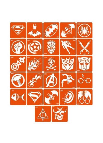 Коллекция трафаретов Троллей, Хелло Китти, свинки Пепы, 16 штук в размере 6 на 6 см. Как сделать био-тату: выберите равномерный участок кожи; хорошо обезжирьте его; снимите с трафарета белую подложку (бумажная основа трафарета); приклейте трафарет на сухую и обезжиренную кожу; аккуратно снимите прозрачную пленку и убедитесь, что трафарет (оранжевая часть) плотно приклеен к коже; нанесите равномерный слой клея для боди-дизайна и дайте ему просохнуть (от 30 секунд до 2 минут в зависимости от слоя клея); нанесите глитер (блестки) на клей и плотно вбейте его кистью для глиттера; смахните излишки глиттера кистью-сметой и снимите трафарет. Зачем нужен трафарет: если не умеете рисовать от руки; если нужно много и быстро рисовать; нужно создавать одинаковые и по размеру, и на вид рисунки – воспользуйтесь трафаретами Fresh Tattoo; трафареты Fresh Tattoo безопасны для кожи и подходят для нанесения временных тату всех типов: глиттер-тату, хной, бархатом, пигментом, джагуа-гелем и так далее; подходят для химического или пескоструйного матирования изделий из стекла (чашки, бокалы, зеркала);