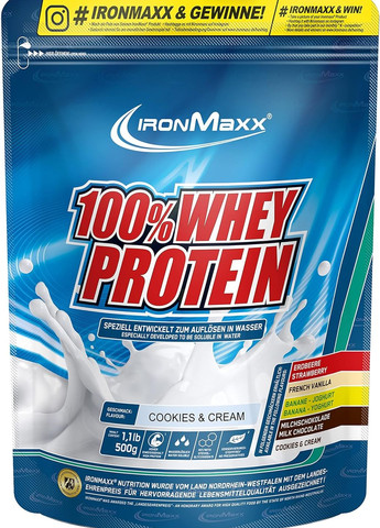 Ironmaxx 100% Whey Protein – высококачественный концентрат сывороточного протеина, выпущенный известным брендом. Добавка идеально подходит спортсменам, главной целью которых является формирование идеального тела с качественной мускулатурой и сухими мышцами. Главным преимуществом препарата является его способность хорошо растворяться в воде, при этом сохраняется приятный вкус готового напитка. Назначение 100% Whey Protein от Ironmaxx: Благодаря уникальному составу, спортивная добавка обеспечивает подпитку мышц протеином, закрытие белкового окна, что крайне необходимо в послетренировочный процесс для стимуляции мышечного роста. Препарат оказывает противодействие катаболическим процессам, способствует подпитке мышц всеми необходимыми питательными веществами, что полностью компенсирует несбалансированное питание. Активные компоненты 100% Whey Protein от Ironmaxx: Главной составляющей препарата является сывороточный протеин – белок натурального происхождения, полученный из молока. Данный компонент хорошо усваивается и стимулирует рост мышечной массы. Спортивная добавка содержит также комплекс необходимых аминокислот (как заменимых, так и незаменимых): комплекс ВСАА (изолейцин, лейцин, валин) – активизирует анаболический процесс, способствует быстрому восстановлению мышц и обеспечивает повышение работоспособности; аланин, аргинин глютамин, цистеин, серин, глицин. Полезные микроэлементы (кальций, фосфор), которые активизируют метаболические процессы и улучшают общее состояние здоровья спортсмена. Преимущества 100% Whey Protein от Ironmaxx: Быстрое и полное растворение в воде. Идеальное соотношение цены и качества продукции. Низкое содержание калорий, жиров и углеводов. Хорошее усвоение препарата. Как принимать 100% Whey Protein от Ironmaxx: Для получения максимального эффекта разработчики препарата рекомендуют принимать его трижды в день. Чтобы приготовить коктейль необходимо в 250 миллилитрах воды растворить 50 грамм препарата. Оптимальным временем для приема считается период до начала физических нагрузок, сразу по их окончанию и непосредственно перед отходом ко сну.