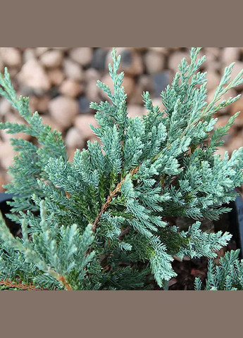 Можжевельник Блю Чип — сорт, характеризующийся ползучей, компактной формой с плотной, декоративной хвоей, которая меняет цвет от серебристо-голубого летом до пурпурного зимой. Этот сорт подходит для альпинариев, каменистых садов и ландшафтных композиций, добавляя яркие цветовые акценты и не требуя сложного ухода. Преимущества можжевельника Блю Чип: Ползучая форма создает плотный декоративный покров; Голубая хвоя летом сменяется на пурпурную зимой; Прекрасно подходит для альпинариев и каменистых садов; Неприхотлив в уходе и легко переносит различные условия; Устойчив к городскому загрязнению воздуха; Компактный размер позволяет использовать в малых садах; Сохраняет декоративность в течение всего года; Хорошо переносит засуху; Можно использовать как почвопокровное растение; Идеален для создания ландшафтных композиций. Селекция можжевельника Блю Чип Можжевельник Блю Чип был выведен в США с целью создания компактного, ползучего сорта для декоративного использования в ландшафтном дизайне. Основная информация о сорте можжевельника Блю Чип Основная особенность можжевельника Блю Чип: яркая сезонная окраска хвои, которая меняется от сине-серебристого летам до пурпурной зимой. Высота взрослого куста можжевельника Блю Чип: до 30-40 см. Место посадки саженцев можжевельника Блю Чип: лучше всего растет на солнечных участках, защищенных от сильных ветров, с хорошо дренированной, плодородной почвой. Схема посадки саженцев можжевельника Блю Чип: 1х1 м, 1,5х1,5 м. Размер посадочной ямы для саженцев можжевельника Блю Чип: должен быть достаточным для размещения корневой системы растений — 60х60х60 см. Темп роста можжевельника Блю Чип: среднегодовой прирост составляет до 10 см в ширину и до 5 см в высоту, формируя плотный покров. Форма кроны можжевельника Блю Чип: стелется по земле, образуя густой, симметричный ковер, идеально подходит для использования как почвопокровное растение. Хвоя можжевельника Блю Чип: мелкая, плотная, текстурированная, сине-серебристая летом, меняется на пурпурную окраску зимой. Отношение к свету можжевельника Блю Чип: нуждается в солнечных местах для яркого окраса хвои, в тени может терять насыщенность цвета. Морозостойкость можжевельника Блю Чип: устойчив к низким температурам, что делает его пригодным для выращивания в различных климатических зонах. Засухоустойчивость можжевельника Блю Чип: отлично переносит засуху, благодаря адаптированной корневой системе, которая позволяет сохранять влагу. Иммунитет к болезням можжевельника Блю Чип: имеет хороший иммунитет, что обеспечивает здоровый рост и устойчивость к неблагоприятным условиям. Рекомендации при посадке саженцев можжевельника Блю Чип Выберите хорошо дренированную, плодородную почву; Выберите солнечное место, защищенное от сильных ветров, чтобы растение получало достаточно солнечного света; Выкопайте яму размером 60х60x60 см, чтобы обеспечить достаточно места для корневой системы; На дно ямы положите дренажный слой из гравия или битого кирпича, затем добавьте компост или перегной для улучшения плодородия почвы; Установите саженец так, чтобы корневая шейка была на уровне почвы, засыпьте корни подготовленной почвенной смесью, уплотняя землю вокруг корневой системы; После посадки обильно полейте саженец (3-4 ведра воды), сформируйте поливальную лунку и