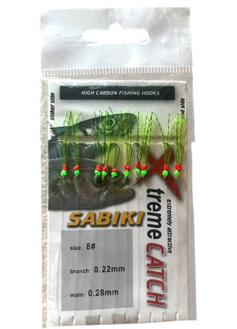 Готовая морска оснастка Xtreme CATCH SABIKI №8-10 крючков (Ставрида, скумбрия, сарган) Готовая морская оснастка с 10 крючками, №8, имитирующая мальков или креветок Каждый крючок оформлен бородкой яркого лимонного цвета с люриксом, чтобы имитировать чешую малька, а также двумя бусинами - красной и светонакопительной При ультрафиолете ярко светится под водой. Перед забросом рекомендуется подсветить УФ-фонарем. 10 острых химически заточенных крючков Диаметр основной лески 0,28мм, диаметр поводков - 0,22мм Самодур эффективен как на море (ставрида, сарган, скумбрия), так и на пресной воде (окунь, судак, даже мелкая щука) Как ловить на самодур: – Прикрепите блесну или грузило к концу – Забросьте с берега или лодки – Делайте ритмичные подтяжки — мушки "играют", как живые мальки – Благодаря множеству крючков можно поймать несколько рыб за раз. Продуманная, проверенная, успешная снасть не оставит Вас без улова!