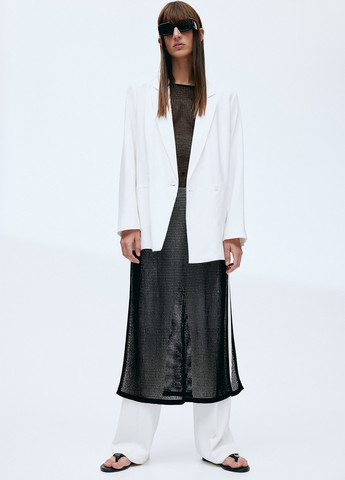 Двухбортный тканевый блейзер свободного кроя с воротником-лацканом. Имеет подплечники, один нагрудный карман и прорезные карманы с окантовкой. Разрез на спине. На подкладке. Длина рукава: 62,5 см (размер M), длина спинки: 75,0 см (размер M), ширина плеч: 47,0 см (размер M).