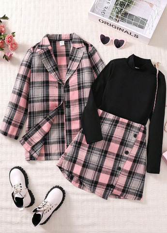 Комплект из клетчатого блейзера и юбки для девочек-подростков. Этот комплект из трёх предметов включает блейзер, однотонную футболку и юбку. Блейзер имеет отложной воротник и длинные рукава. Футболка однотонная и с длинными рукавами. Юбка выполнена в повседневном стиле. Комплект изготовлен из смеси полиэстера и хлопка. Подходит для весенних и осенних температур. Рекомендации по уходу: машинная стирка или профессиональная химчистка.
