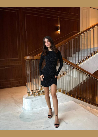 Это элегантное мини платье создано для того, чтобы привлекать внимание и подчеркивать женственность в самые яркие моменты. Плотная упругая ткань обеспечивает идеальную посадку, выгодно очерчивает силуэт и дарит комфорт во время движения. Вся поверхность платья украшена мерцающим декором, красиво переливающимся при освещении и создающим эффект настоящей вечерней роскоши. Модель имеет длинные рукава и изящный высокий вырез, которые придают образу сдержанности и благородной эстетики. Благодаря продуманному крою платье визуально извлекает фигуру и формирует гармоничный, пропорциональный силуэт. Минидлина делает образ смелым и одновременно элегантным. Идеальный вариант для торжеств, новогодних праздников, вечеринок, выходов в ресторан или каких-либо событий, где хочется выглядеть особенно эффектно. Платье отлично сочетается с классическим каблуком, минималистическими аксессуарами и клатчами. Это стиль, который выглядит дорого и собранно – наряд, подчеркивающий уверенность и индивидуальность каждой женщины.