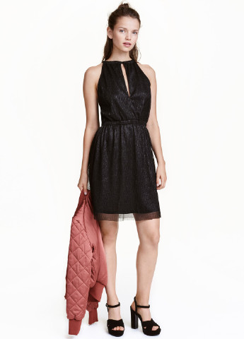 Короткое платье из просвечивающего трикотажа с добавлением блестящих нитей. Вырез спереди и сзади, а также завязки на шее. Отрезная модель с резинкой на талии. На подкладке. Возможно повреждение бирки.