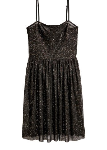 Короткое платье из блестящего тюля на узких, регулируемых бретелях и с потайной молнией с одной стороны. Отрезное по присборенному шву на талии, слегка расклешенная юбка-колокол с необработанным нижним краем. Без подкладкиВозможно повреждение бирки