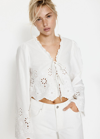 Короткая блузка из нежной хлопковой ткани с вышивкой бродери англез. Имеет V-образный вырез с оборкой, открытый перед с двумя парами очень узких завязок-лент, длинные широкие рукава-буфы и фестончатые края рукавов и подола. Для размера XS: полуобхват груди 45 см, длина 44 см.