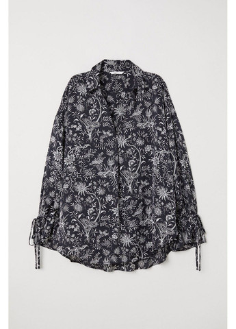 Широкая блуза из ткани с рисунком. На рубашке отложной воротник и треугольный вырез горловины, а также складка спереди. Заниженная линия плеча и длинные пышные рукава. Скругленный нижний край, спинка немного удлинена. Возможно повреждение бирки
