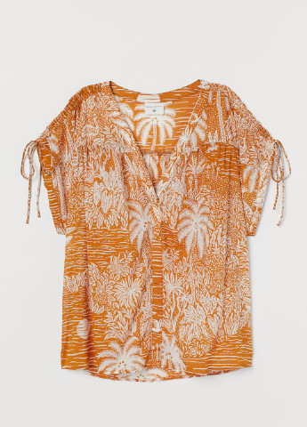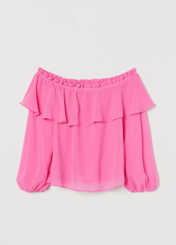 Блузка с открытыми плечами из воздушной ткани с жатым эффектом. Сверху резинка и широкая оборка. Длинные, довольно широкие рукава с манжетами на резинке. Трикотажная подкладка.