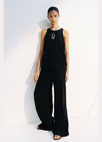 Брюки: Широкие брюки с высокой посадкой зрительно удлиняют ноги и создают элегантный и стройный силуэт. Свободный крой обеспечивает комфорт движений, а складки спереди придают штанам структурность и изысканность.
