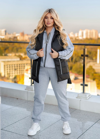 Костюм тройка изготовлен из плащевки и тринитки, которая имеет гладкую фактуру. Тринитка имеет небольшую эластичность, учитывайте это при подборе размера. Благодаря своему оверсайз фасону - костюм хорошо садится по фигуре. Жилетка прямого кроя с капюшоном, имеет наполнитель силикон 150 г/м². Дополнительно присутствуют два накладных кармана по бокам с вшитыми лентами. Застегивается на молнию и имеет завышенный воротник-стойку. Бомбер с длинными рукавами на мягких манжетах и с лампасами. Рукава фасона реглан, плечевой шов идет от проймы до горловины. Бомбер застегивается на молнию, имеет два прорезных кармана по бокам и резинку по нижней части. Брюки фасона джоггеры на манжетах, с высокой посадкой, талия на резинке без застежек. По бокам присутствуют два кармана с отрезным бочком. 50-52 р-р: Жилетка: ОГ 118, ОТ 118, ОС 120, длина жилетки 76; Бомбер: ОГ 116, ОТ 116, ОС 116, длина бомбера 62, длина рукава 71; Брюки: ОТ 76-106, ОС 112, длина штанов 106; 54-56 р-р: Жилетка: ОГ 126, ОТ 126, ОС 128, длина жилетки 78; Бомбер: ОГ 124, ОТ 124, ОС 124, длина бомбера 62, длина рукава 72; Брюки: ОТ 86-114, ОС 120, длина брюк 107; 58-60 р-р: Жилетка: ОГ 134, ОТ 134, ОС 136, длина жилетки 80; Бомбер: ОГ 132, ОТ 132, ОС 132, длина бомбера 63, длина рукава 74; Брюки: ОТ 96-122, ОС 128, длина штанов 107; 62-64 р-р: Жилетка: ОГ 140, ОТ 140, ОС 142, длина жилетки 82; Бомбер: ОГ 140, ОТ 140, ОС 140, длина бомбера 65, длина рукава 74; Брюки: ОТ 110-130, ОС 138, длина брюк 107; Замеры делались по верхней части готового изделия. ОГ - объем груди. ОТ - объем талии. ОС - объем бедер.