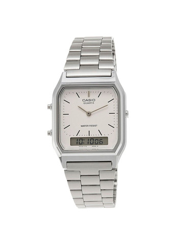 Наручные часы Casio Vintage AQ-230A-7DMQYES в ретро-стиле серебристый 28 мм Casio Vintage AQ-230A-7DMQYES – это уникальные наручные часы, сочетающие ретро-дизайн и современный функционал. Благодаря своему элегантному виду и высокой функциональности он станет стильным аксессуаром и надежным помощником в повседневной жизни. Особенности дизайна Часы выполнены в классическом ретро-стиле с шестикубическим корпусом, что придает ему винтажный шарм. Серебристый корпус из полированной нержавеющей стали и белый циферблат создают утонченный внешний вид. Аналого-цифровой дисплей обеспечивает удобное считывание времени и дополнительных данных, а пластиковые стекла надежно защищают часы от внешних воздействий. Функциональность Casio AQ-230A-7DMQYES оснащен кварцевым механизмом, обеспечивающим высокую точность хода. Часы отображают время, дату, день недели, месяц, а также поддерживают формат 24-часового показа. Дополнительные функции: Вторая временная зона — настройка и отслеживание времени в другом часовом поясе. Это особенно удобно для путешественников или людей, работающих с разными странами. Секундомер – измерение пройденного времени, промежуточных и финальных результатов с точностью до сотых долей секунды. Таймер и будильник – звуковое уведомление о важных событиях. Автоматический календарь – всегда показывает правильную дату. Комфорт и надежность Эти часы оснащены браслетом из нержавеющей стали с матовым покрытием, которое не только долговечно, но и удобно регулируется под размер запястья. Застежка-клипса обеспечивает надежную фиксацию, а вес всего 44 грамма делает часы практически невесомыми на руке. Технические характеристики: Материалы: корпус и браслет из нержавеющей стали, пластиковое стекло. Размер корпуса: диаметр 28 мм (без учета головки), высота 8 мм. Ширина браслета: 15 мм. Максимальный обхват браслета: 200 мм. Вес: 44 г. Водонепроницаемость: 3 BAR (защита от брызг и дождя). Цвет: серебристый с белым циферблатом. Производитель: Casio. Страна регистрации бренда: Япония. Почему стоит выбрать Casio Vintage AQ-230A-7DMQYES? Эти часы представляют собой воплощение универсальности и стиля. Он подходит как для повседневной носки, так и для особых случаев. Благодаря высокому качеству и функциональности, он станет незаменимым аксессуаром для мужчин, ценящих надежность и элегантность. ]]