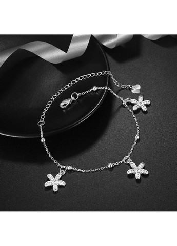 Серебристый женский браслет из ювелирного сплава на ногу. Присутствует удлиняющая цепочка, браслет можно носить как на руке так и на ноге. Имеет карабинную застежку и украшен декорами в виде цветочков.