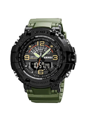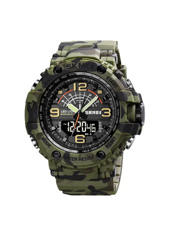 Мужские наручные часы Skmei 1520 Наручные часы SKMEI 1520 – это спортивная модель, стильный дизайн которой оценят мужчины предпочитают брутальные аксессуары и придерживаются этого стиля в одежде. Качественные противоударные материалы оградят механизм устройства от повреждений, водонепроницаемость позволит не снимать часов даже когда Вы принимаете душ или плаваете в бассейне. Управление всеми функциями осуществляется нажатием нескольких кнопок, вы без труда запустите секундомер даже во время бега по беговой дорожке. Особенности часов SKMEI 1520 Кварцевый механизм Кварцевый механизм часов гарантирует точность хода в течение всего периода эксплуатации, а дополнительный электронный циферблат будет очень удобен в темное время суток. Материал корпуса Корпус из высококачественного пластика увеличивает ударопрочность девайса, также надежно защищает механизм от повреждений при ударе. Повышенная прочность гарантирует сохранение SKMEI 1520 во время экстремального отдыха, спорта и путешествий. Они идеально подойдут для спортсменов и любителей активного отдыха. Противоударное стекло Стекло из композитных материалов успешно противостоит появлению царапин и сколов. Надежность крепежа Классический замок-пряжка с двойной металлической застежкой Tang Buckle из нержавеющей стали надежно удерживает браслет на запястье и предохраняет от случайного расстегивания. Качество материалов браслета Браслет, изготовленный из немецкого полиуретана, обеспечивает надежную фиксацию часов на запястье и имеет широкий диапазон регулировок. Водонепроницаемость Специальные материалы, из которых выполнены часы, являются отличной защитой от влаги. Вы можете спокойно принимать душ, мыть руки или плавать, не задумываясь о сохранении часов. Задняя крышка циферблата из нержавеющей стали надежно защищает механизм, а нанесенная на нее фирменная гравировка является отличительной чертой оригинальных часов SKMEI. Подсветка Электролюминесцентная подсветка позволяет узнать время даже в полной темноте. Достаточно нажать кнопку, и приятный зеленый цвет осветит элементы циферблата. Дизайн Модель SKMEI 1520 имеет агрессивный дизайн с большими, выступающими формами. Они подчеркнут мужество своего владельца и придутся по вкусу любому мужчине. Основные функции: Секундомер Отображение даты и дня недели Подсветка Будильник Двойной циферблат Режим 12/24 час Комплект поставки: Часы Инструкция (Русский язык) Гарантийный талон Без коробочки (противоударная упаковка) Цвета в наличии: Черные, Зеленые, Серые, Камуфляж наличие цвета уточняйте у менеджера-консультанта