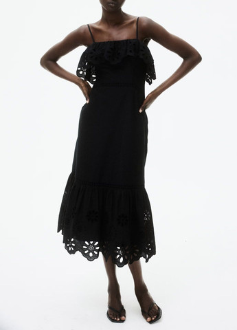 Платье к икрам из легкой хлопковой ткани с английской вышивкой. Прямой вырез горловины, широкий волан сверху и узкие регулируемые бретельки. Скрытая боковая молния и расклешенное деление. Подкладка.