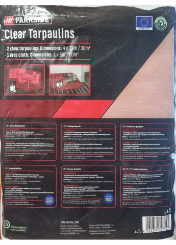 2 прозрачных пленки: Эффективная защита от пыли, грязи и влаги Размеры: 4 х 7,5 м/30 м² Эти брезенты HDPE изготовлены из полиэтилена высокой плотности, который можно переделать 1 капельная ткань: Сверхпрочная, особенно устойчивая к разрывам ткань для внутреннего использования. Размеры: 4 х 5 м/20 м² Эта ткань из ПВД сделана из полиэтила низкой плотности, который можно переделать Не игрушка. Риск удушения Храните продукт и упаковку в недоступном для детей месте.