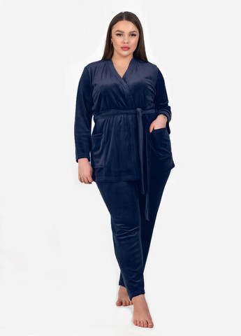 Домашний комплект-тройка (костюм) выполнен из мягкого и приятного для тела трикотажа велюра. Состоит из халата на запах, топа (майки) с длинными рукавами и брюк. Ткань хорошо тянется. Замеры готового изделия: Размер 42-44: Топ: ОГ 98 см, ОТ 96 см, длина 61 см. Брюки: ОТ 64-84 см (на резинке), ОС 102 см, длина 101/75 см. Халат: длина 85 см, рукав 62 см. Размер 46-48: Топ: ОГ 102 см, ОТ 100 см, длина 62 см. Брюки: ОТ 70-90 см (на резинке), ОС 108 см, длина 102/76 см. Халат: длина 86 см, рукав 63 см. Размер 50-52: Топ: ОГ 106 см, ОТ 104 см, длина 64 см. Брюки: ОТ 76-96 см (на резинке), ОС 114 см, длина 103/77 см. Халат: длина 88 см, рукав 64 см. Размер 54-56: Топ: ОГ 110 см, ОТ 108 см, длина 65 см. Брюки: ОТ 82-102 см (на резинке), ОС 120 см, длина 104/78 см. Халат: длина 90 см, рукав 65 см.