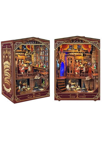 Бук Нук Magic Studio – это волшебный набор для создания собственного миниатюрного мира магии и тайн. Внутри вы найдете атмосферную комнату колдуна с книгами, колбами, свечами и прочими деталями, создающими эффект настоящей магической лаборатории. Набор станет отличным подарком для любителей хендмейда, любителей фэнтези и всех, кто ценит творчество и уют. После сборки бук-нук можно использовать как уникальное украшение для книжной полки или ночник с LED-подсветкой. Характеристика: Модель: SQ-54 Название: Magic Studio DIY Wooden Book Nook Kit Тип: 3D интерьерный конструктор/бук нук Тематика: магическая студия, фэнтези Материалы: дерево, бумага, электронные элементы Подсветка: LED (с выключателем) Время сборки: 3–5 часов Уровень складности: 268 шт Размер готовой модели: 23×15,6×11 см Питание: от батарей (в комплект не входят) Возраст: от 14 лет Назначение: для декора, коллекционирования, развития творчества